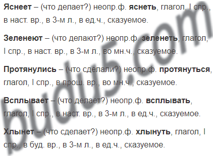 Образец записи: Светлеет – (что делает?) неопр.ф. светлеть, глагол, I спр., в наст. вр., в 3-м л., в ед.ч., сказуемое.
