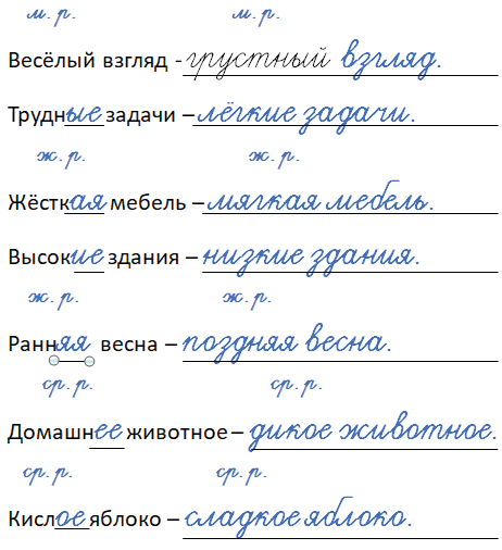 • Запишите рядом с каждым словосочетанием словосочетание, состоящее из этого же имени существительного и противоположного по смыслу имени прилагательного.