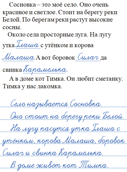 Сосновка – это моё село. Оно очень красивое и светлое. Стоит на берегу реки Белой. По берегам реки растут высокие сосны.