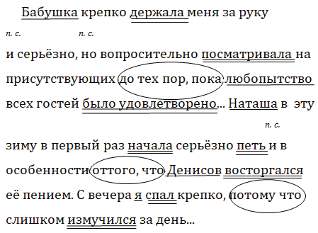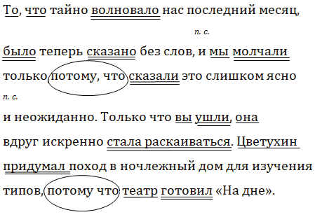1. Бабушка крепко держала меня за руку и серьёзно но вопросительно посматривала на присутствующих до тех пор пока любопытство всех гостей было удовлетворено3... (Л. Толстой) 2. Наташа в эту зиму в первый раз начала серьёзно петь и в особенности оттого что Денисов восторгался её пением. (Л. Толстой) 3. С вечера я спал крепко потому что слишком измучился за день... (И. Бунин) 4. То что тайно волновало нас последний месяц было теперь сказано без слов и мы молчали только потому что сказали это слишком ясно и неожиданно3. (И. Бунин) 5. Только что вы ушли она вдруг искренно стала раскаиваться. (Ф. Достоевский) 6. Цветухин придумал поход в ночлежный дом для изучения типов потому что театр готовил «На дне». (К. Федин)