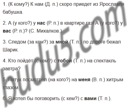 1. К (мы) скоро приедет из Ярославля бабушка. 2. А у (мы) в квартире газ! А у (вы)? (С. Михалков.) 3. Следом за (я) по дороге бежал Шарик. 4. Кто пойдёт с (ты) на спектакль завтра? 5. Петух посмотрел на (я) хитрым глазом. 6. Я хотел бы поговорить с (вы).