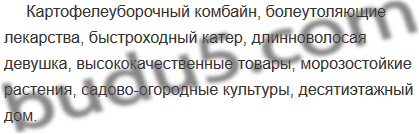 Комбайн для уборки картофеля; лекарства, утоляющие боль; катер с быстрым ходом; девушка с длинными волосами; товары высокого качества; растения, стойкие в морозы; садовые и огородные культуры; дом в десять этажей.
