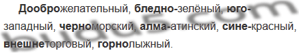 (Добро)желательный, (бледно)зелёный, (юго)запад-ный, (черно)морский, (алма)атинский, (сине)красный, (внешне)торговый, (горно)лыжный.