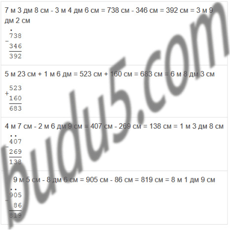 | 5 м 23 см + 1 м 6 дм | 9 м 5 см - 8 дм 6 см |