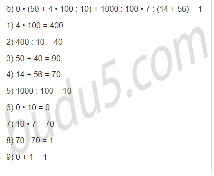б) 0 • (50 + 4 • 100 : 10) + 1000 : 100 • 7 : (14 + 56)
