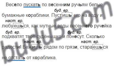 Вес..ло пускат.. по в..сенн... руч..ям белые бумажные к..раблики. Пустиш.. его на воду и любуеш..ся, как мутные воды весенн... руч..йка подхватят твоё судёнышко и пон..сут. Сколько радост..! Беж..ш.. рядом по гряз.., стараеш..ся не отстат.. от к..раблика.
